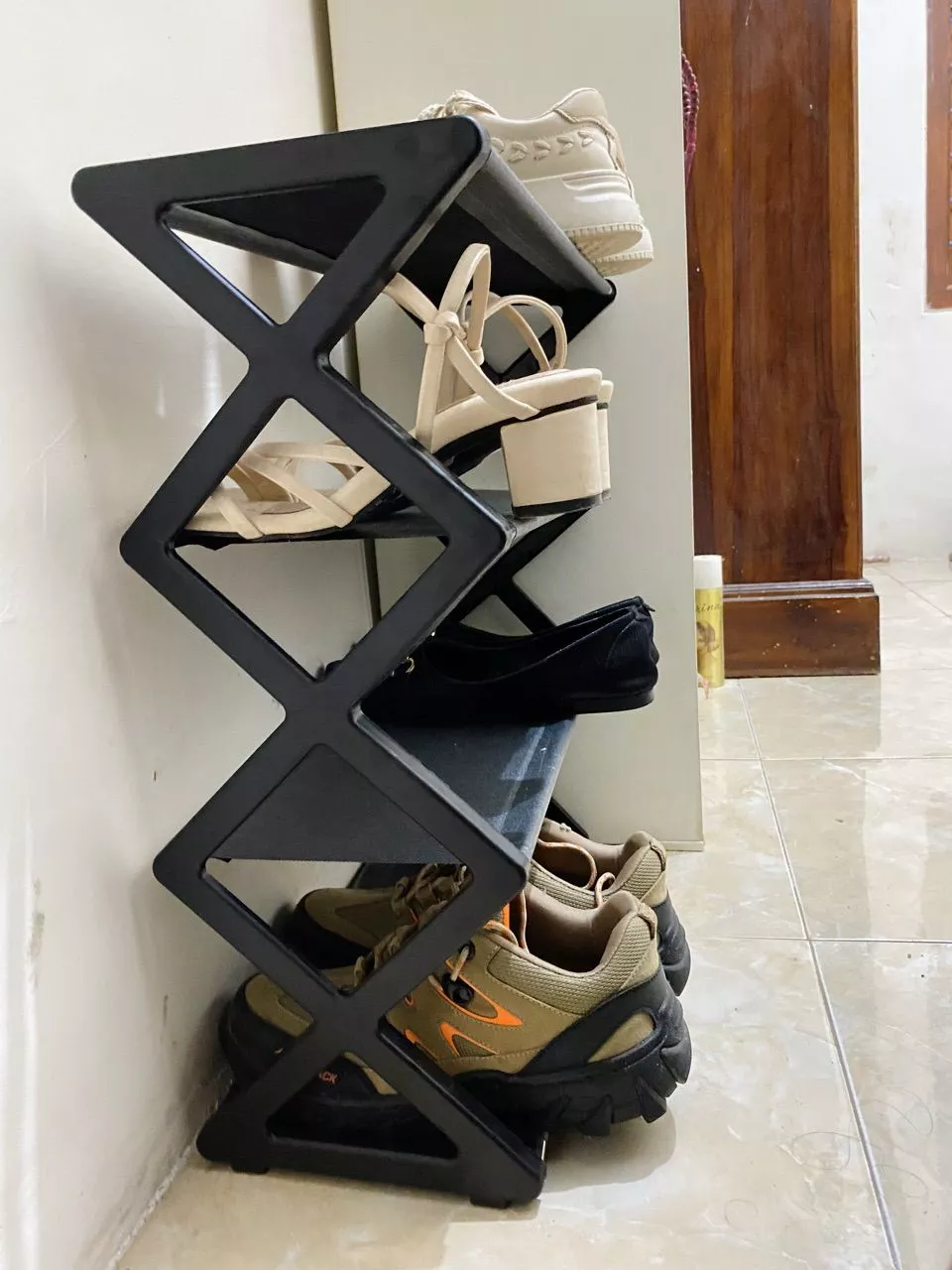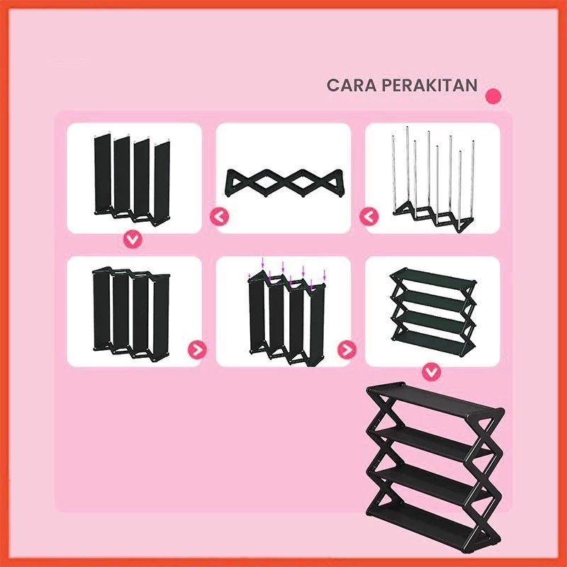 • Desain bertingkat yang menghemat ruang lantai namun mampu menampung banyak sepatu.